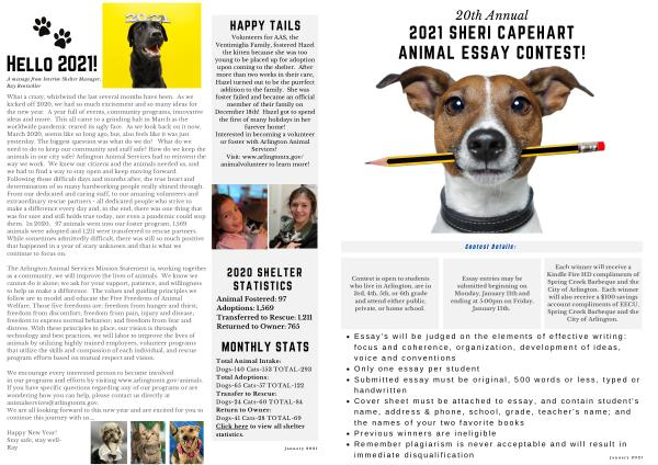 We encourage every interested person to become involved in our programs and efforts by visiting www . arlingtontx . gov / animals . If you have specific questions regarding any of our programs or are wondering how you can help , please contact us directly at animalservices @ arlingtontx . gov . We are all looking forward to this new year and are excited for you to continue this journey with us ….