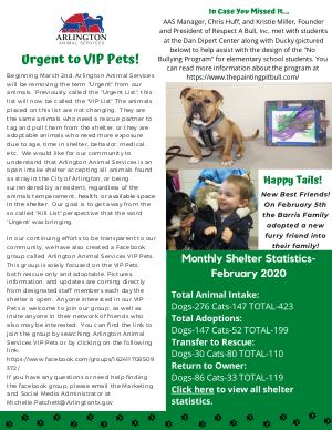 Beginning March 2nd , Arlington Animal Services will be removing the term " Urgent " from our animals . Previously called the " Urgent List ", this list will now be called the " VIP List " The animals placed on this list are not changing . They are the same animals who need a rescue partner to tag and pull them from the shelter , or they are adoptable animals who need more exposure due to age , time in shelter , behavior , medical , etc . We would like for our community to understand that Arlington Animal Services is an open intake shelter accepting all animals found as stray in the City of Arlington , or being surrendered by a resident , regardless of the animals temperament , health , or available space in the shelter . Our goal is to get away from the so called " Kill List " perspective that the word ' Urgent ' was bringing .