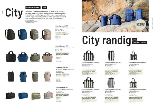 ett aktivt uteliv kommer även behovet att ta med sig det viktigaste. I en stilren design, med praktisk funktion och brett användningsområde. Citykollektionen innehåller kylväskor i olika modeller anpassade för ett aktivt liv. City serien har ett yttermaterial i rPET. Kampanjpriser gäller vid order med förädling i vår B2B-portal: www. profile. sagaformgroup. com