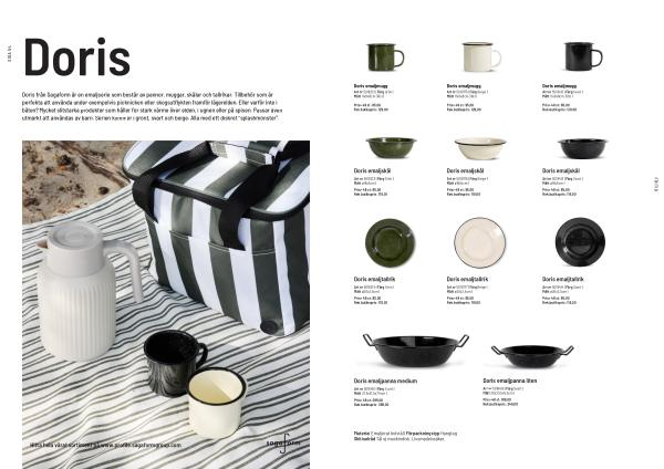 Doris från Sagaform är en emaljserie som består av pannor, muggar, skålar och tallrikar. Tillbehör som är perfekta att använda under exempelvis picknicken eller skogsutflykten framför lägerelden. Eller varför inte i båten? Mycket slitstarka produkter som håller för stark värme över elden, i ugnen eller på spisen. Passar även utmärkt att användas av barn. Serien kommer i grönt, svart och beige. Alla med ett diskret” splashmönster”.