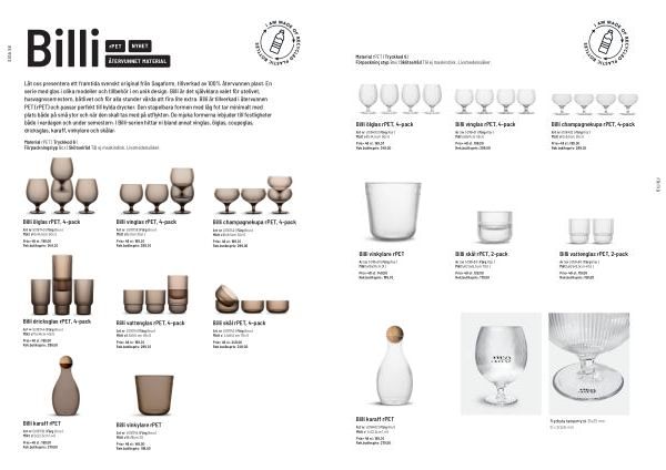 Låt oss presentera ett framtida svenskt original från Sagaform, tillverkad av 100 % återvunnen plast. En serie med glas i olika modeller och tillbehör i en unik design. Billi är det självklara valet för utelivet, husvagnssemestern, båtlivet och för alla stunder värda att fira lite extra. Billi är tillverkad i återvunnen PET( rPET) och passar perfekt till kylda drycker. Den stapelbara formen med låg fot tar minimalt med plats både på små ytor och när den skall tas med på utflykten. De mjuka formerna inbjuder till festligheter både i vardagen och under semestern. I Billi-serien hittar ni bland annat vinglas, ölglas, coupeglas, dricksglas, karaff, vinkylare och skålar.