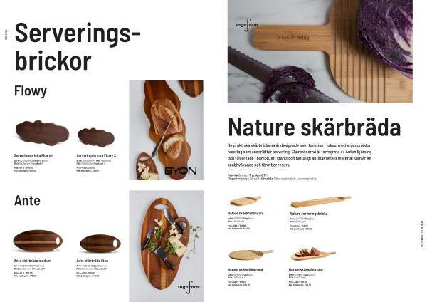 De praktiska skärbrädorna är designade med funktion i fokus, med ergonomiska handtag som underlättar servering. Skärbrädorna är formgivna av Anton Björsing och tillverkade i bambu, ett starkt och naturligt antibakteriellt material som är en snabbväxande och förnybar resurs.