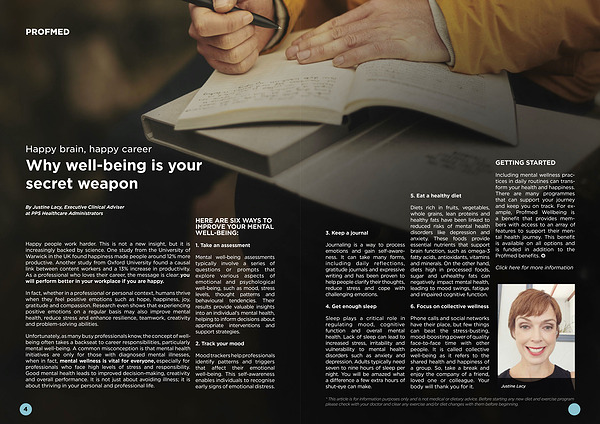 Including mental wellness practices in daily routines can transform your health and happiness . There are many programmes that can support your journey and keep you on track . For example , Profmed Wellbeing is a benefit that provides members with access to an array of features to support their mental health journey . This benefit is available on all options and is funded in addition to the Profmed benefits .