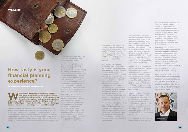 While receiving food or wine as part of a dining experience, you will never be able to touch or taste or see what you are paying for when it comes to receiving financial advice. The closest you will get to something tangible is a copy of your financial plan that contains facts, figures and recommendations. This is the fundamental nature of the financial services industry and most probably also the greatest challenge for advisers and for you as the financial consumer.