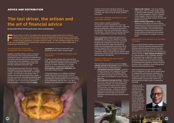 • Trust experience but stay involved – While a taxi driver may know the best route, a wellinformed passenger who understands the general direction remains more in control of the journey. The same principle applies to financial planning – trusting an adviser’ s expertise is essential but staying actively engaged in financial decisions ensures alignment with personal goals and long-term success.