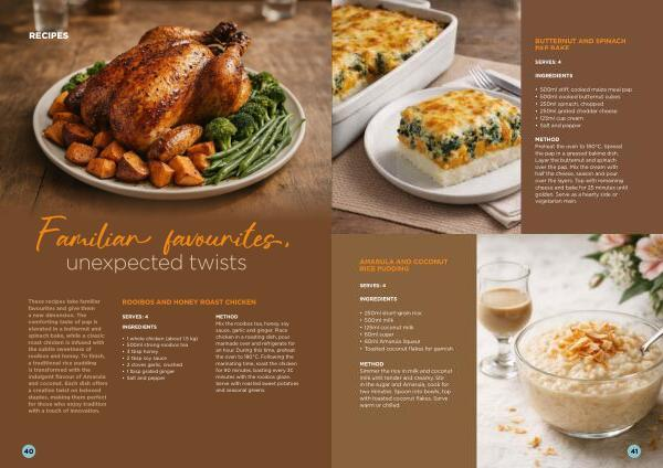 These recipes take familiar favourites and give them a new dimension. The comforting taste of pap is elevated in a butternut and spinach bake, while a classic roast chicken is infused with the subtle sweetness of rooibos and honey. To finish, a traditional rice pudding is transformed with the indulgent flavour of Amarula and coconut. Each dish offers a creative twist on beloved staples, making them perfect for those who enjoy tradition with a touch of innovation.