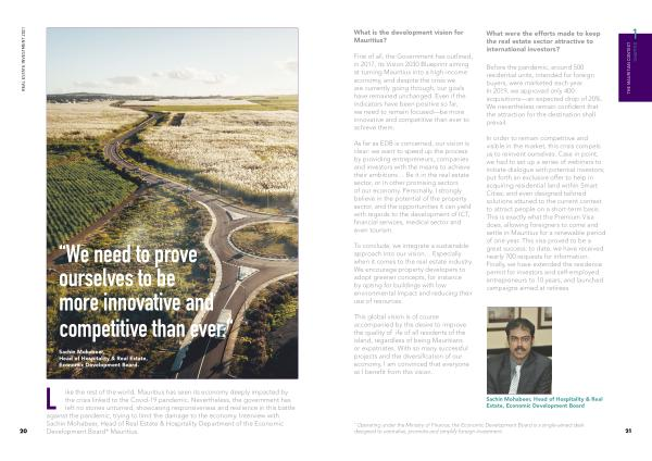 L ike the rest of the world , Mauritius has seen its economy deeply impacted by the crisis linked to the Covid-19 pandemic . Nevertheless , the government has left no stones unturned , showcasing responsiveness and resilience in this battle against the pandemic , trying to limit the damage to the economy . Interview with Sachin Mohabeer , Head of Real Estate & Hospitality Department of the Economic Development Board * Mauritius .