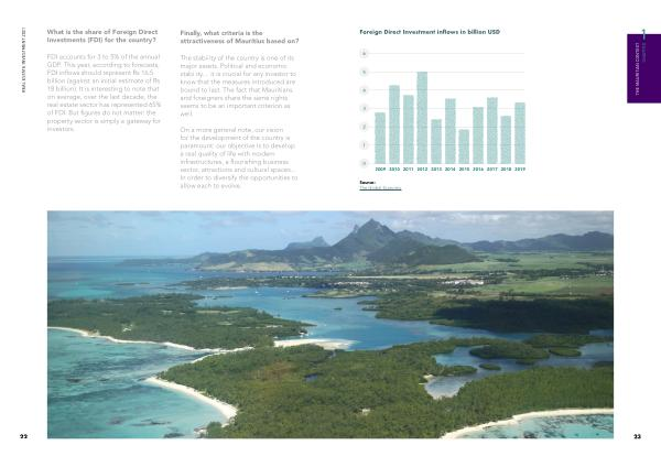 FDI accounts for 3 to 5 % of the annual GDP . This year , according to forecasts , FDI inflows should represent Rs 16.5 billion ( against an initial estimate of Rs 18 billion ). It is interesting to note that on average , over the last decade , the real estate sector has represented 65 % of FDI . But figures do not matter : the property sector is simply a gateway for investors .