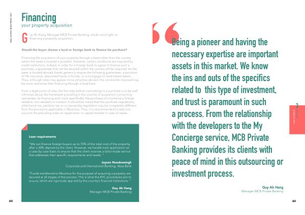 Being a pioneer and having the necessary expertise are important assets in this market . We know the ins and outs of the specifics related to this type of investment , and trust is paramount in such a process . From the relationship with the developers to the My Concierge service , MCB Private Banking provides its clients with peace of mind in this outsourcing or investment process .