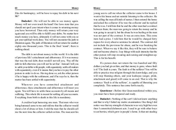 Dadashri: He will not be able to see money again. Money will not even touch his hand! Our laws state that you should not spoil your intent when it comes to returning money you have borrowed. Then only money will return your way again and you will be able to fulfill your debts. No matter how much money you have, ultimately it will not come with you so get your spiritual work done. You will not encounter the path to liberation again. The path of liberation will not return for another eighty-one thousand years. This is the final‘ stand’; there is nothing ahead.