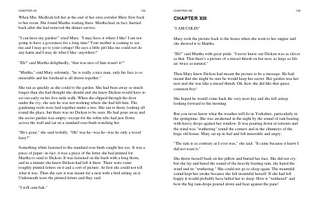 When Mrs. Medlock left her at the end of her own corridor Mary flew back to her room. She found Martha waiting there. Martha had, in fact, hurried back after she had removed the dinner service.