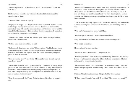 " You can ' t if you stay in a room," said Mary. " I couldn ' t go on the moor," he said in a resentful tone. Mary was silent for a minute and then she said something bold. " You might--sometime." He moved as if he were startled. " Go on the moor! How could I? I am going to die."