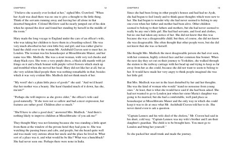 But Mrs. Medlock was not in the least disturbed by her and her thoughts. She was the kind of woman who would " stand no nonsense from young ones." At least, that is what she would have said if she had been asked. She had not wanted to go to London just when her sister Maria ' s daughter was going to be married, but she had a comfortable, well paid place as housekeeper at Misselthwaite Manor and the only way in which she could keep it was to do at once what Mr. Archibald Craven told her to do. She never dared even to ask a question.