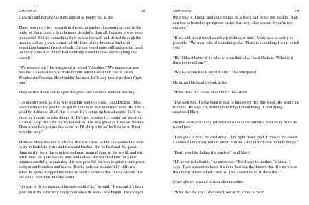 " He ' ll like it better if us talks o ' somethin ' else," said Dickon. " What is it tha ' s got to tell me?"