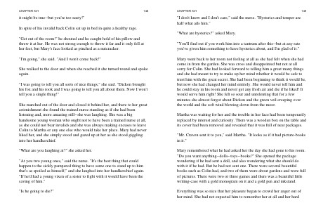 She marched out of the door and closed it behind her, and there to her great astonishment she found the trained nurse standing as if she had been listening and, more amazing still--she was laughing. She was a big handsome young woman who ought not to have been a trained nurse at all, as she could not bear invalids and she was always making excuses to leave Colin to Martha or any one else who would take her place. Mary had never liked her, and she simply stood and gazed up at her as she stood giggling into her handkerchief.