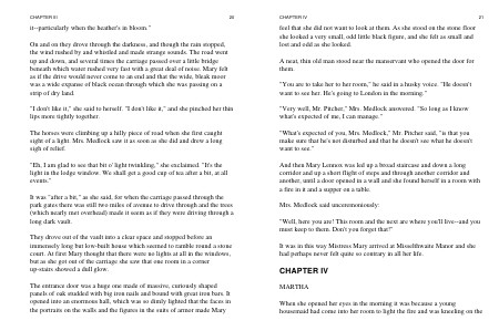 And then Mary Lennox was led up a broad staircase and down a long corridor and up a short flight of steps and through another corridor and another, until a door opened in a wall and she found herself in a room with a fire in it and a supper on a table.