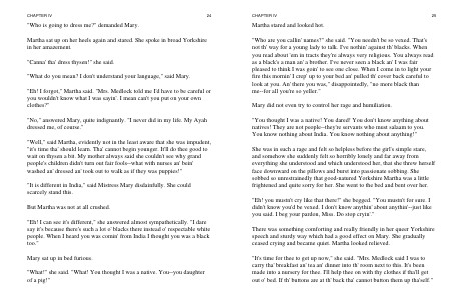 " Eh! I can see it ' s different," she answered almost sympathetically. " I dare say it ' s because there ' s such a lot o ' blacks there instead o ' respectable white people. When I heard you was comin ' from India I thought you was a black too."