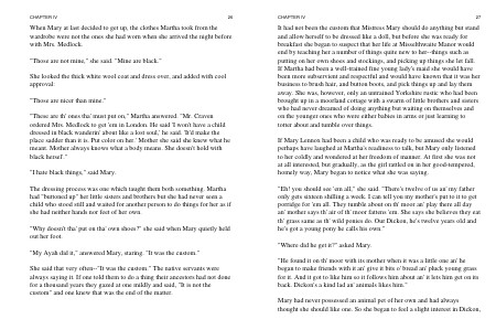 " Eh! you should see ' em all," she said. " There ' s twelve of us an ' my father only gets sixteen shilling a week. I can tell you my mother ' s put to it to get porridge for ' em all. They tumble about on th ' moor an ' play there all day an ' mother says th ' air of th ' moor fattens ' em. She says she believes they eat th ' grass same as th ' wild ponies do. Our Dickon, he ' s twelve years old and he ' s got a young pony he calls his own."