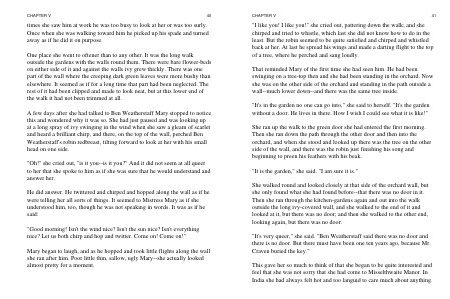 She ran up the walk to the green door she had entered the first morning. Then she ran down the path through the other door and then into the orchard, and when she stood and looked up there was the tree on the other side of the wall, and there was the robin just finishing his song and beginning to preen his feathers with his beak.