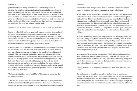 It was not until she climbed to the second floor that she thought of turning the handle of a door. All the doors were shut, as Mrs. Medlock had said they were, but at last she put her hand on the handle of one of them and turned it. She was almost frightened for a moment when she felt that it turned without difficulty and that when she pushed upon the door itself it slowly and heavily opened. It was a massive door and opened into a big bedroom. There were embroidered hangings on the wall, and inlaid furniture such as she had seen in India stood about the room. A broad window with leaded panes looked out upon the moor; and over the mantel was another portrait of the stiff, plain little girl who seemed to stare at her more curiously than ever.