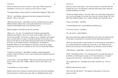 " Well," said Martha stoutly, " I ' ve told thee that th ' very birds likes him an ' th ' rabbits an ' wild sheep an ' ponies, an ' th ' foxes themselves. I wonder," staring at her reflectively, " what Dickon would think of thee?"
