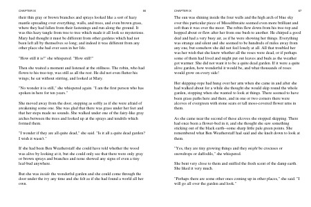 As she came near the second of these alcoves she stopped skipping. There had once been a flower-bed in it, and she thought she saw something sticking out of the black earth--some sharp little pale green points. She remembered what Ben Weatherstaff had said and she knelt down to look at them.