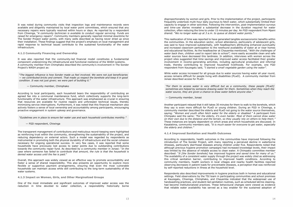 According to respondents, health outcomes in the communities have improved following the introduction of The Sonder Project, with many reporting a perceived decline in waterborne illnesses, particularly diarrhoeal diseases among children under five. Respondents noted that although previous hygiene promotion campaigns had increased knowledge levels, their impact was limited by the absence of reliable access to clean water. A Chimpako committee member described:“ It [ the Sonder borehole ] has improved hygiene and saved time for many of us.” The availability of a consistent water supply through the project was widely cited as addressing this critical sanitation barrier, contributing to improved health conditions. According to community members, health workers in local villages and nearby health facilities reported observing decreases in patient loads for preventable diseases, a perception that was reinforced by self-reported reductions in illness at the household level.