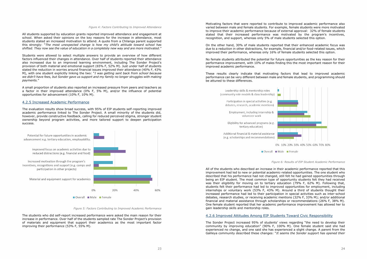 All of the students who described an increase in their academic performance reported that this improvement had led to new or potential academic-related opportunities. The one student who described that his performance had not changed, still felt he had gained opportunities through being an EIP student. The most common type of opportunity students felt they had received was their eligibility for moving on to tertiary education( 79 % F, 62 % M). Following that, students felt their performance had led to improved opportunities for employment, including internships or voluntary work( 53 % F, 43 % M). Around a third of students thought their increased performance had led to their participation in special activities such as inter-school debates, research studies, or receiving academic mentions( 32 % F, 33 % M); and / or additional financial and material assistance through scholarships or recommendations( 26 % F, 38 % M). One female student reported that her academic performance improvement has allowed her to gain leadership skills and mentorship roles.