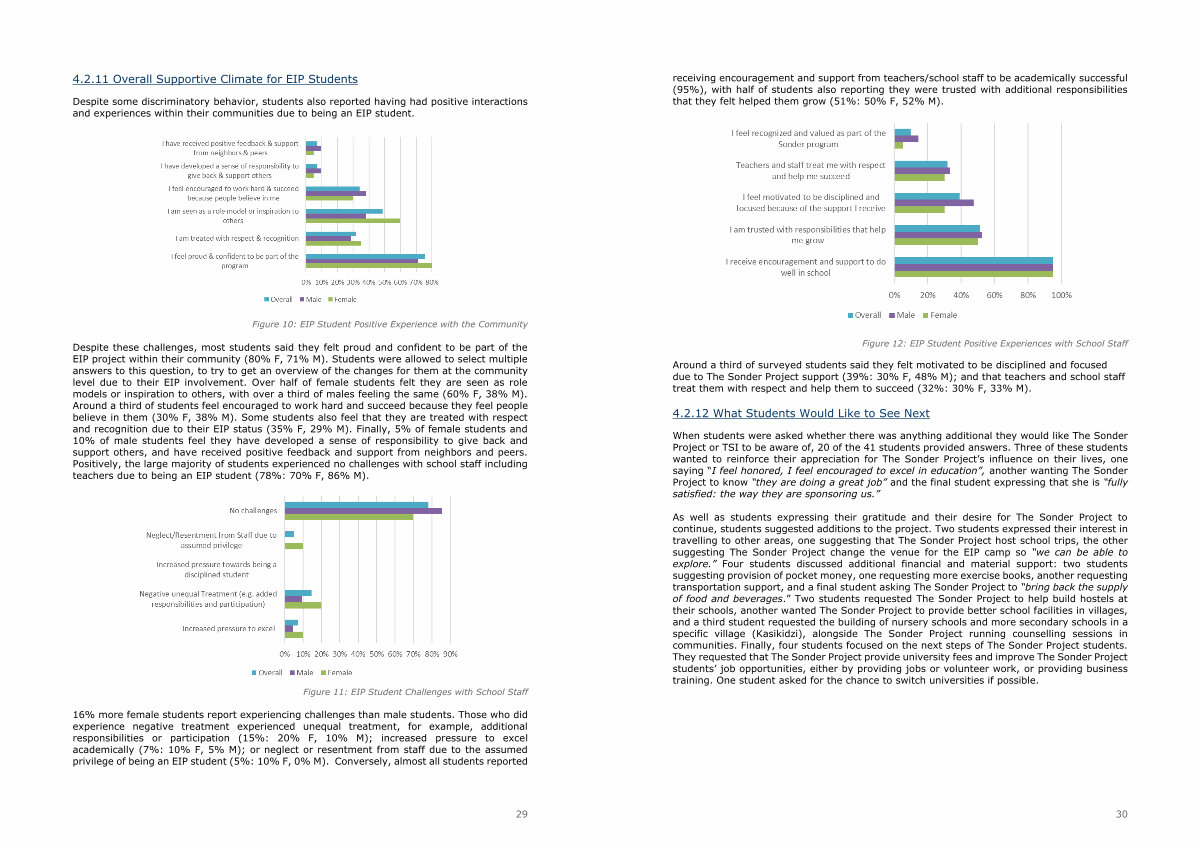 Despite these challenges, most students said they felt proud and confident to be part of the EIP project within their community( 80 % F, 71 % M). Students were allowed to select multiple answers to this question, to try to get an overview of the changes for them at the community level due to their EIP involvement. Over half of female students felt they are seen as role models or inspiration to others, with over a third of males feeling the same( 60 % F, 38 % M). Around a third of students feel encouraged to work hard and succeed because they feel people believe in them( 30 % F, 38 % M). Some students also feel that they are treated with respect and recognition due to their EIP status( 35 % F, 29 % M). Finally, 5 % of female students and 10 % of male students feel they have developed a sense of responsibility to give back and support others, and have received positive feedback and support from neighbors and peers. Positively, the large majority of students experienced no challenges with school staff including teachers due to being an EIP student( 78 %: 70 % F, 86 % M).