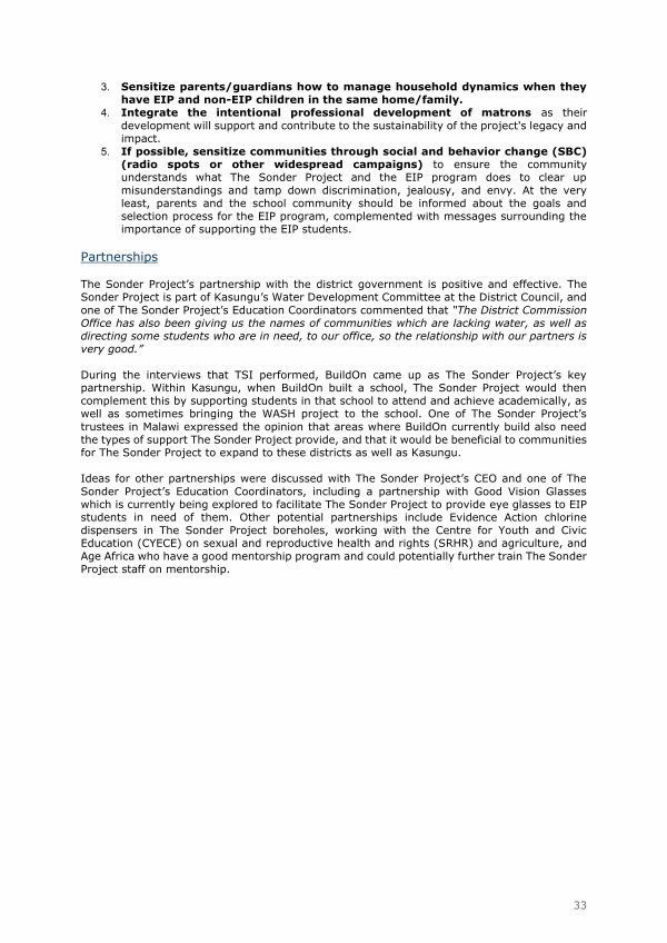 During the interviews that TSI performed, BuildOn came up as The Sonder Project’ s key partnership. Within Kasungu, when BuildOn built a school, The Sonder Project would then complement this by supporting students in that school to attend and achieve academically, as well as sometimes bringing the WASH project to the school. One of The Sonder Project’ s trustees in Malawi expressed the opinion that areas where BuildOn currently build also need the types of support The Sonder Project provide, and that it would be beneficial to communities for The Sonder Project to expand to these districts as well as Kasungu.