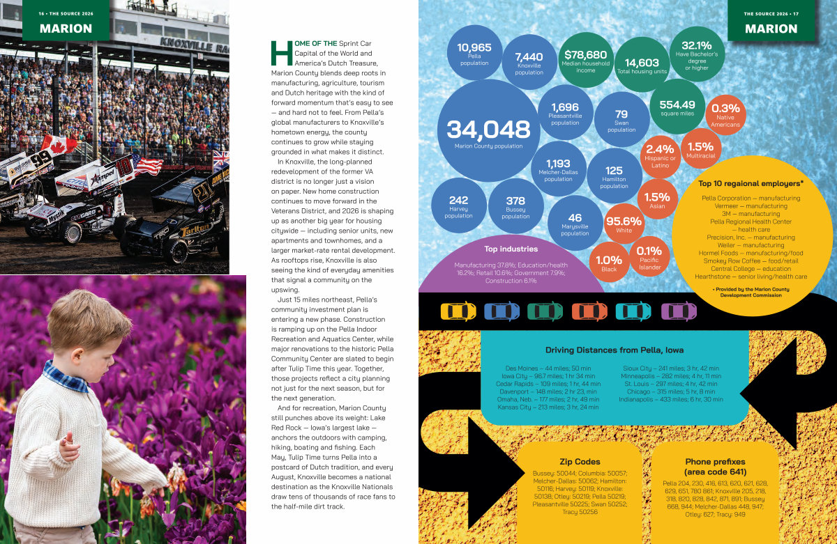 HOME OF THE Sprint Car Capital of the World and America’ s Dutch Treasure, Marion County blends deep roots in manufacturing, agriculture, tourism and Dutch heritage with the kind of forward momentum that’ s easy to see— and hard not to feel. From Pella’ s global manufacturers to Knoxville’ s hometown energy, the county continues to grow while staying grounded in what makes it distinct.