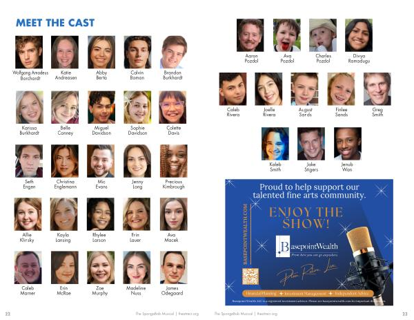 22 The SpongeBob Musical | theatrecr . org MEET THE CAST Wolfgang Amadeus Borchardt Katie Andreasen Abby Berta Calvin Boman Brandon Burkhardt Karissa Burkhardt Belle Canney Miguel Davidson Sophie Davidson Colette Davis Seth Engen Christina Englemann Mic Evans Jenny Long Precious Kimbrough Allie Klinsky Kayla Lansing Rhylee Larson Erin Lauer Ava Macek Caleb Marner Erin McRae Zoe Murphy Madeline Nuss James Odegaard