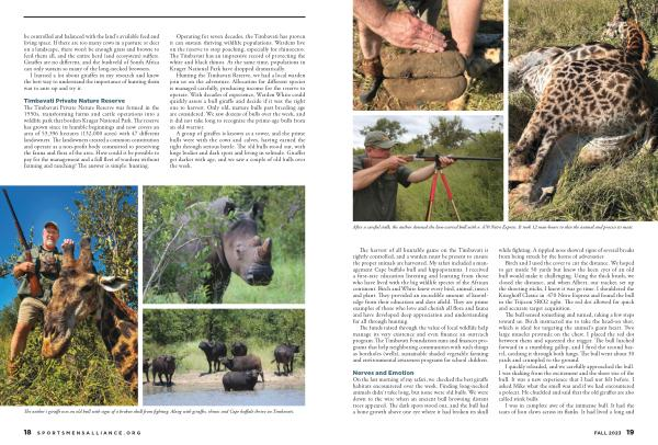 The harvest of all huntable game on the Timbavati is tightly controlled , and a warden must be present to ensure the proper animals are harvested . My safari included a management Cape buffalo bull and hippopotamus . I received a first-rate education listening and learning from those who have lived with the big wildlife species of the African continent . Birch and White knew every bird , animal , insect and plant . They provided an incredible amount of knowledge from their education and days afield . They are prime examples of those who love and cherish all flora and fauna and have developed deep appreciation and understanding for all through hunting .