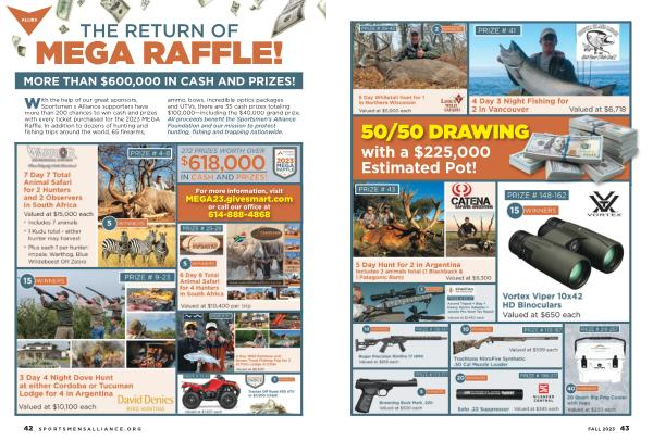 Sportsmen ’ s Alliance supporters have more than 200 chances to win cash and prizes with every ticket purchased for the 2023 MEGA Raffle . In addition to dozens of hunting and fishing trips around the world , 65 firearms ,