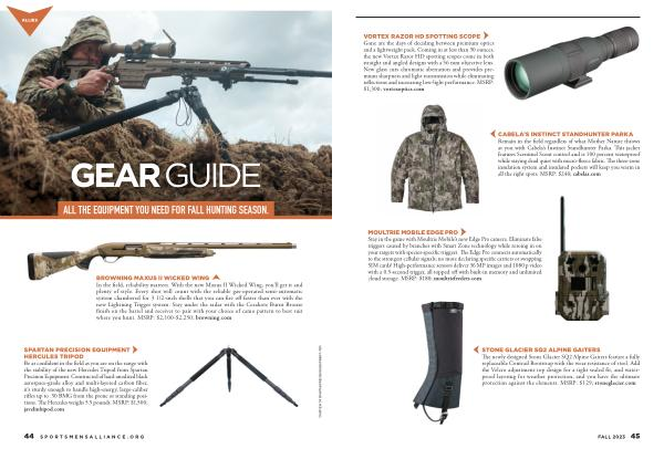 VORTEX RAZOR HD SPOTTING SCOPE Gone are the days of deciding between premium optics and a lightweight pack . Coming in at less than 30 ounces , the new Vortex Razor HD spotting scopes come in both straight and angled designs with a 56 mm objective lens . New glass cuts chromatic aberration and provides premium sharpness and light transmission while eliminating reflections and increasing low-light performance . MSRP : $ 1,300 ; vortexoptics . com