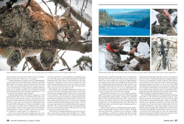 We trekked as fast as possible , fighting deep snow up to our knees with every step . We maneuvered over , under and around never-ending deadfall , which made it impossible to use snowshoes . We listened to the chorus of dogs ahead to keep us excited . Occasionally , we stopped and watched how the chase unfolded on the GPS tracker attached to the dogs ’ collars . The big tom cat was on the move , swinging around a small lake and heading up the far shore . The cat was cagey and turned away to lead the dogs in the opposite direction . Twice , the big-tracked cat gave the dogs the slip , but the veteran hounds circled , picked up the scent and were able to continue the chase .