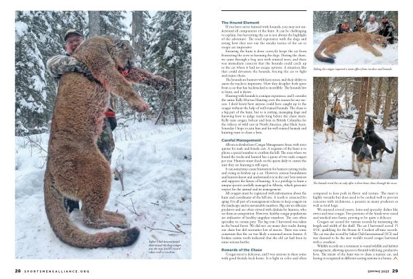 Hunting with hounds is a unique experience , and I consider the entire Kelly Morton Hunting crew the reason for my success . I don ’ t know how anyone could have caught up to the cougar without the help of well-trained hounds . The chase is a big part of the hunt , but so is cutting , managing dogs and knowing how to judge tracks long before the chase starts . Kelly runs cougar , bobcat and lynx in British Columbia for the trifecta of wild cats in North America , plus black bears . Someday I hope to join him and his well-trained hounds and hunting team to chase a lynx .
