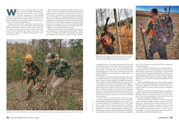 When I hear some iteration of this comment , I know there ’ s a chance to sway the perception of hunting in the mind and memory bank of a non-hunter ( this goes for firearms , too ). To be clear , I ’ m not trying to convince the person to hunt , to argue about hunting or to completely change his mind . Rather , my goal is to reaffirm the positive beliefs or facts an individual currently knows , and then to give him facts around any myths he believes to be true . It might or might not completely change his mind on that single point , but it ’ s something for his brain to digest that could prove persuasive down the road ( like when a legislative issue or ballot initiative comes up ).