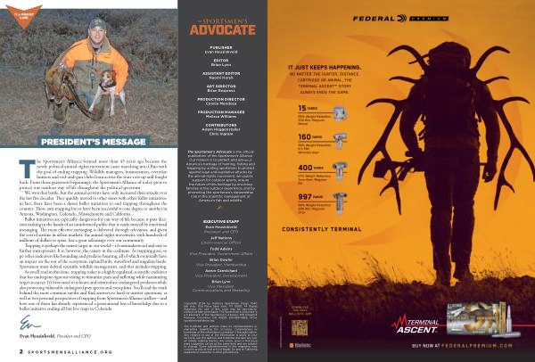The Sportsmen ’ s Advocate is the official publication of the Sportsmen ’ s Alliance . Our mission is to protect and advance America ’ s heritage of hunting , fishing and trapping by uniting sportsmen to protect against legal and legislative attacks by the animal-rights movement , win public support for outdoor sports , ensure the future of this heritage by involving families in the outdoor experience , and by promoting the sportsmen ’ s stewardship role in the scientific management of America ’ s fish and wildlife .