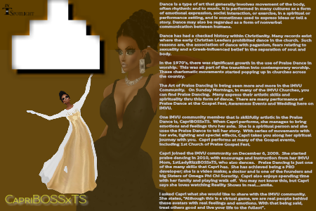 One IMVU community member that is skillfully artistic in the Praise Dance is, CapriBOSSxTS. When Capri performs, she manages to bring emotions and feelings thru her avie. She is a spiritual person and she uses the Praise Dance to tell her story. With series of movements with her avie, lighting and special effects, Capri takes you along her spiritual journey with you. Capri performs at many of the Gospel events, including 1st Church of Praise Gospel Fest.