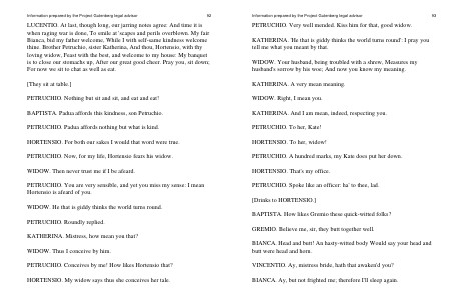 KATHERINA. A very mean meaning. WIDOW. Right, I mean you. KATHERINA. And I am mean, indeed, respecting you. PETRUCHIO. To her, Kate! HORTENSIO. To her, widow! PETRUCHIO. A hundred marks, my Kate does put her down. HORTENSIO. That ' s my office. PETRUCHIO. Spoke like an officer: ha ' to thee, lad. [ Drinks to HORTENSIO.] BAPTISTA. How likes Gremio these quick-witted folks? GREMIO. Believe me, sir, they butt together well.
