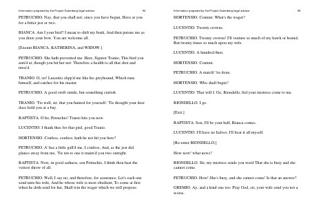 LUCENTIO. A hundred then. HORTENSIO. Content. PETRUCHIO. A match! ' tis done. HORTENSIO. Who shall begin? LUCENTIO. That will I. Go, Biondello, bid your mistress come to me. BIONDELLO. I go. [ Exit.] BAPTISTA. Son, I ' ll be your half, Bianca comes. LUCENTIO. I ' ll have no halves; I ' ll bear it all myself. [ Re-enter BIONDELLO.] How now! what news?