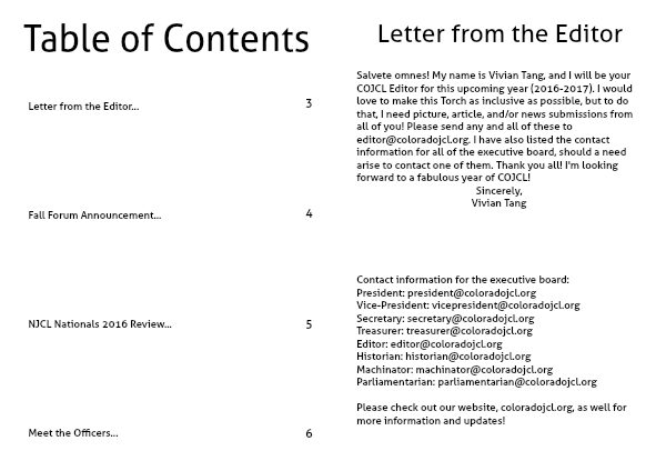 Salvete omnes! My name is Vivian Tang, and I will be your COJCL Editor for this upcoming year (2016-2017). I would love to make this Torch as inclusive as possible, but to do that, I need picture, article, and/or news submissions from all of you! Please send any and all of these to editor@coloradojcl.org. I have also listed the contact information for all of the executive board, should a need arise to contact one of them. Thank you all! I'm looking forward to a fabulous year of COJCL!