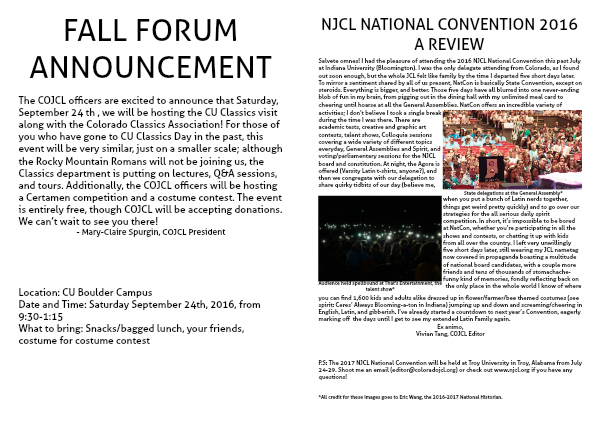 The COJCL officers are excited to announce that Saturday, September 24 th , we will be hosting the CU Classics visit along with the Colorado Classics Association! For those of you who have gone to CU Classics Day in the past, this event will be very similar, just on a smaller scale; although the Rocky Mountain Romans will not be joining us, the Classics department is putting on lectures, Q&A sessions, and tours. Additionally, the COJCL officers will be hosting a Certamen competition and a costume contest. The event is entirely free, though COJCL will be accepting donations. We can’t wait to see you there!