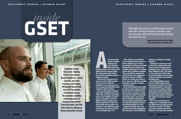 From an eerily empty Goldman Sachs office building in the heart of the City of London , Daniel Mallinson , head of EMEA execution services , alongside co-heads of EMEA electronic trading , Alex Harman and David Cornish , tell The TRADE that throughout the COVID-19 crisis GSET has gained market share and broken several records multiple times over .