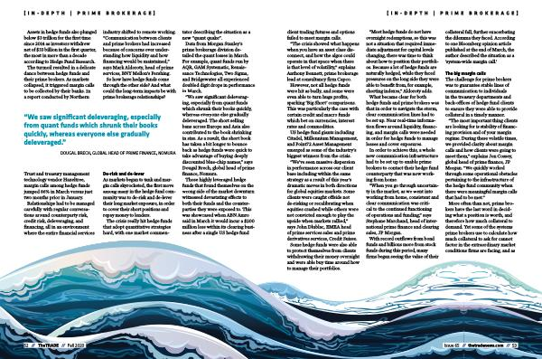 The big margin calls The challenge for prime brokers was to guarantee stable lines of communication to individuals in the treasury departments and back-offices of hedge fund clients to ensure they were able to provide collateral in a timely manner .