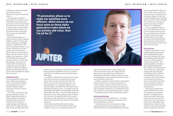 Climbing the Poole From managing the fixed income team , which is currently up to three , in November 2022 Poole was promoted to the overall head of trading for Jupiter – and for him , it ’ s been a natural progression .