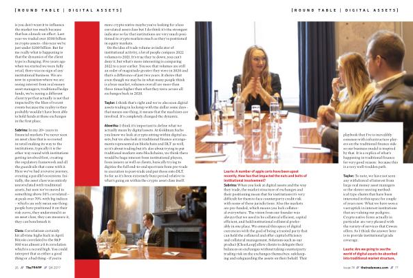 Abeetha : I think it ' s important to define what we actually mean by digital assets . At Goldman Sachs you know we look at crypto sitting within digital assets , but we also look at traditional finance arrangements represented on blockchain and DLT as well , so it ’ s about trading but it ’ s also about trying to put traditional markets onto blockchains , we think there would be huge interest from institutional players , from issuers as well as clients , basically trying to digitise the full end-to-end spectrum from pre-trade to execution to post-trade and put those onto DLT . So for us it ' s been extremely busy period relative to what ' s going on within the crypto asset class itself .
