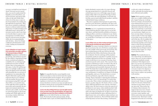 Laurie : Adoption of crypto regulation and would a stronger regulatory framework help or hinder ? Abeetha : Regulation is definitely a good thing , and I think we need it for the industry . Regulation brings clarity , institutional adoption , scalability . For us , looking to put traditional securities on blockchains , there is lots going on in this space . In the UK and Europe there are multiple sandboxes trying to put digital assets onto DLT , and amending the current sets of regulation to accommodate that . The EU DLT pilot regime which will kick off next year will basically streamline the post-trade environment using DLT rails and that will be a very positive step in the right direction to make the post-trade and eventually the pretrade environment much more efficient and scalable . In the 1970s we went from paper to electronic trading and I think right now we are seeing a similar shift from electronic to digital .