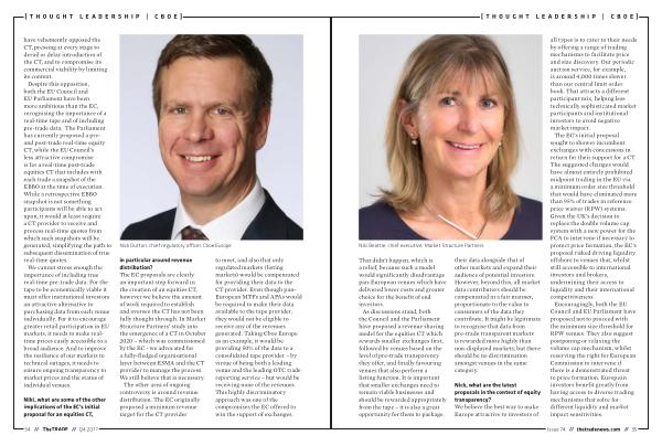 in particular around revenue distribution ? The EC proposals are clearly an important step forward in the creation of an equities CT , however we believe the amount of work required to establish and oversee the CT has not been fully thought through . In Market Structure Partners ’ study into the emergence of a CT in October 2020 – which was commissioned by the EC - we advocated for a fully-fledged organisational layer between ESMA and the CT provider to manage the process . We still believe that is necessary .